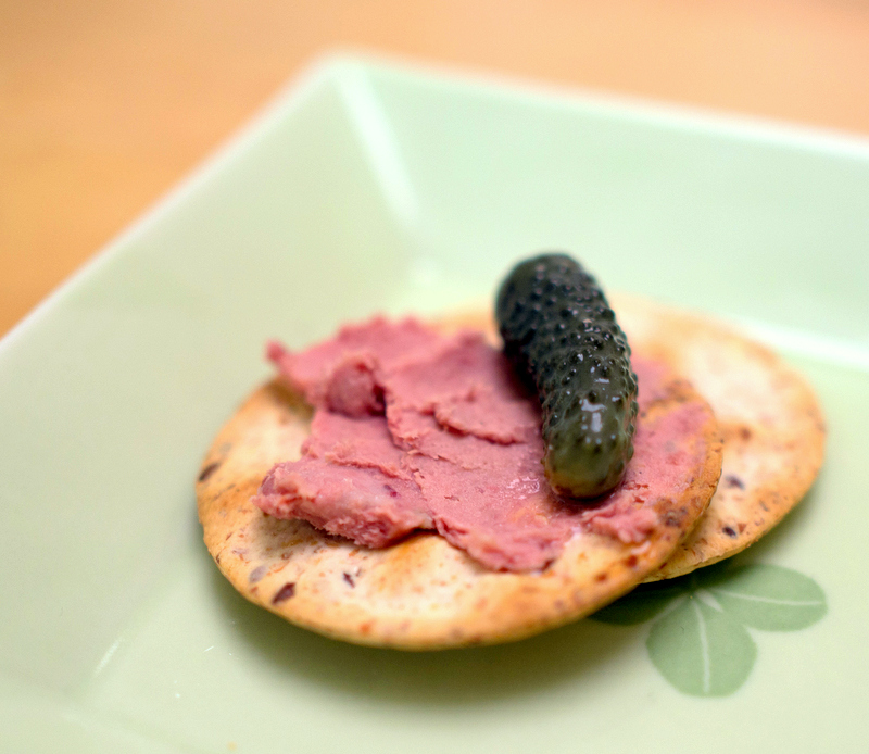 - Braunschweiger liverwurst on crackers, with tiny pickled gherkins.