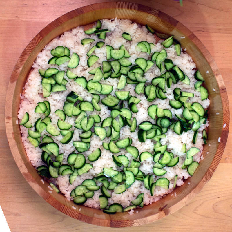 - Cook the rice in a rice cooker. When done, put it in a large platter and lightly mix the sushi vinegar into it, turning the rice with a paddle and taking care not to squish the grains. Traditionally, you can use a fan to help the steam evaporate and give it a glossy look. If you’re not going to use the sushi rice right away, cover it with a damp towel so it doesn’t dry out.