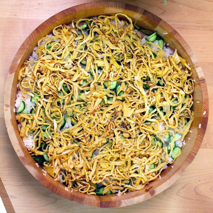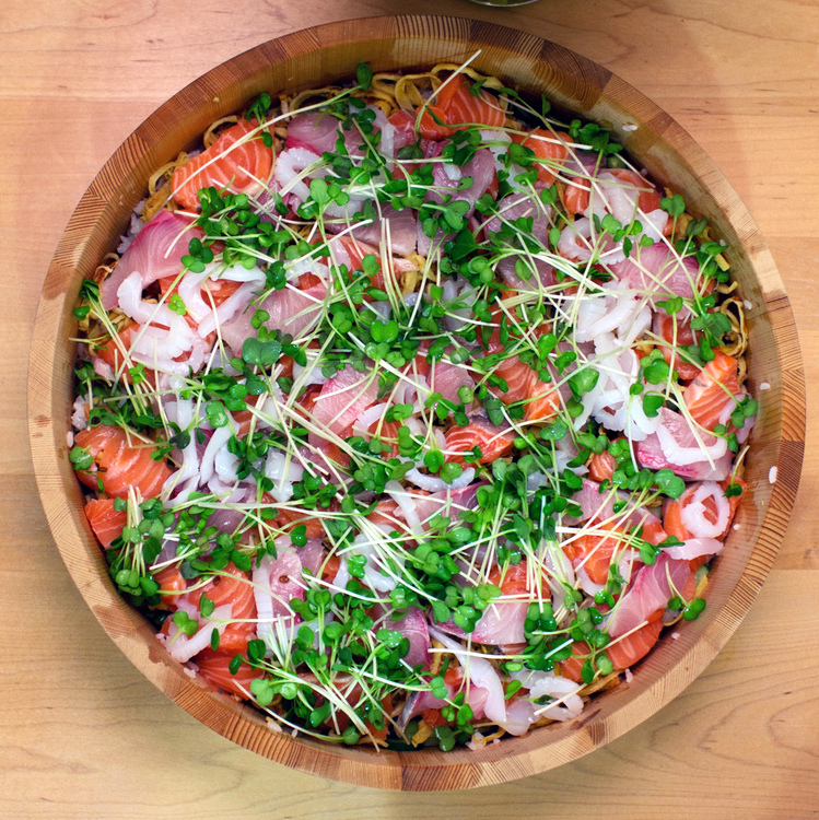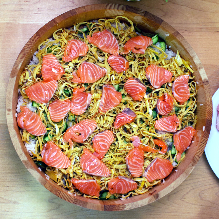 But to return to the question of raw fish. It turns out that this tradition is actually a Malaysian/Singaporean thing and was invented in 1964. The whole business, of course, revolves around the Chinese love for homophones. In Chinese, raw fish sounds like “lots of prosperity” and is served at New Year’s in a salad form. Shredded daikon, carrots, jellyfish, turnips, key lime leaves, pomelo, peanuts and other ingredients are tossed with the fish, typically salmon, as everyone shouts various lucky phrases and stirs it with their chopsticks. Lost in this mish-mash, the minuscule amount of raw fish is further obscured by a sweet sauce, and with everyone tossing and yelling over it, it somehow doesn’t seem quite as appetizing. So every Chinese new year, I’ve taken to making my own lucky version with lots more fish. Basically, I serve chirashizushi instead and so far, none of the guests have complained.