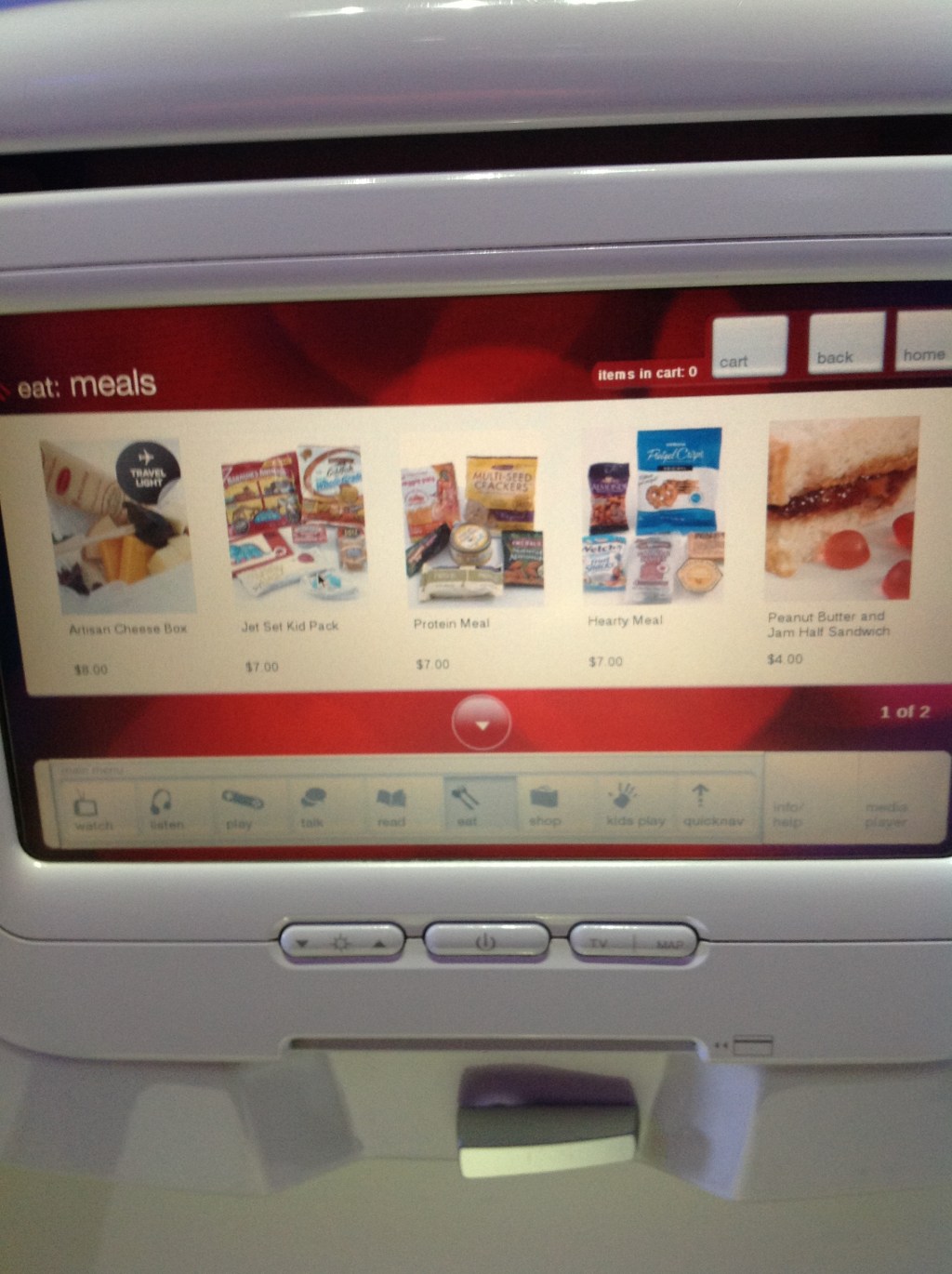 I was excited to discover, however, that you can now order food through your individual touch screen TV and pay for it by swiping your credit card. Giddy that humanity was finally moving towards Willy Wonka’s visionary TV chocolate, I studied the menu. Virgin America has clearly tried to position itself as a trend setter. The usual suspects of chips and nuts are redeployed under the guise of “Artisan Cheese Box” (cheese and crackers) and “Protein Meal” (nuts and energy bars). Not to be outdone, I pressed the button for “Non-GMO caramel popcorn sprinkled with sea salt” (100cal) and waited. It arrived in precisely in 3 minutes, brought by a passing stewardess. Later, I also ordered some dried fruit and nuts mashed together and Pringles. Each came in under 5 minutes, delivered in the same noiselessly unobtrusive manner.